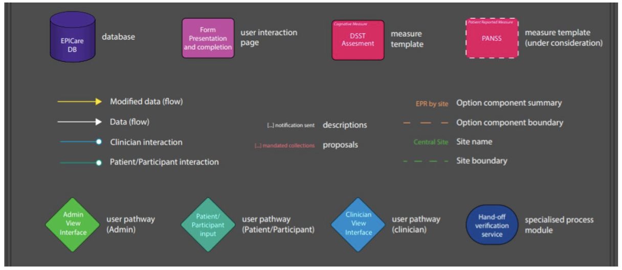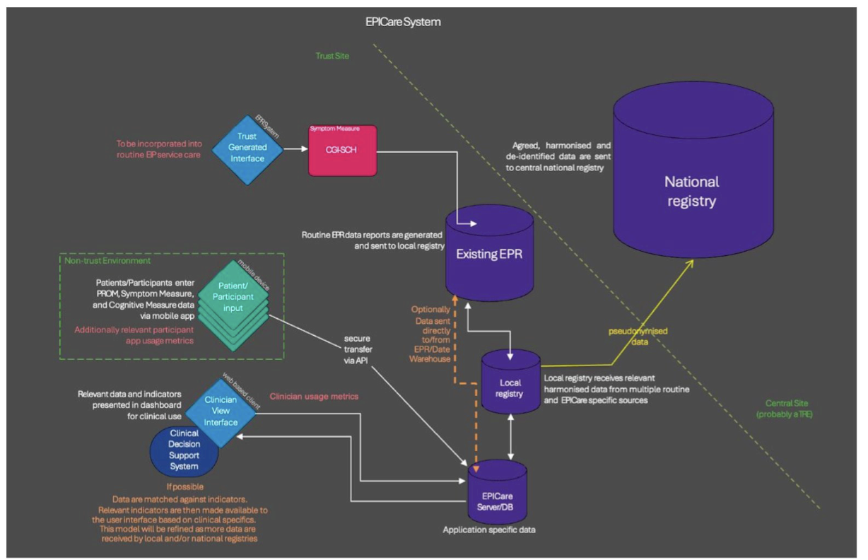 The EPICare dashboard can be launched via the existing Trust Electronic Health Record (EHR) system (e.g. Carenotes, RiO) and used by clinicians to view the data collected as part of the EPICare programme (patient demographics, data corresponding to the NICE psychosis care standards, Clinician-reported outcome measures (CROMs), and Patient-reported outcome measures (PROMs).